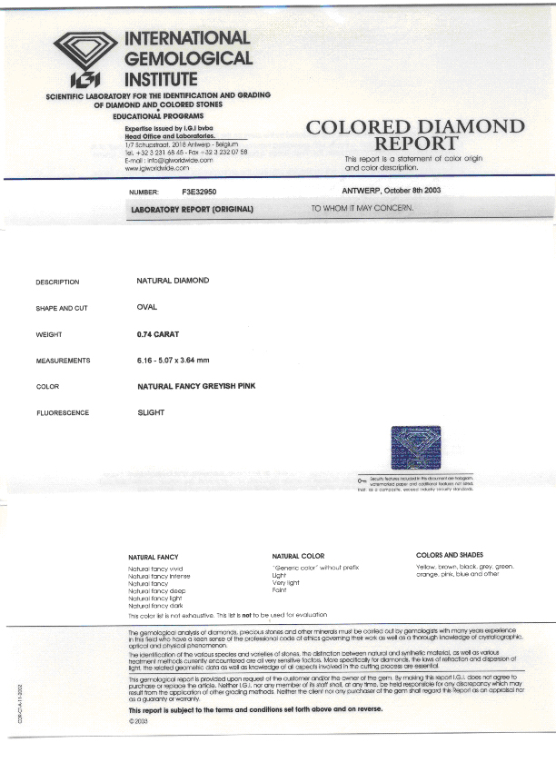 Ci-dessous un exemple de rapport pour diamant de couleur Rose avec une nuance secondaire de gris.