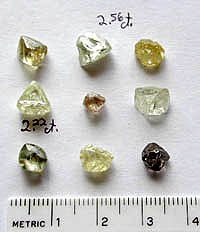 Diamants bruts de différentes formes, couleurs et poids lors du tri.